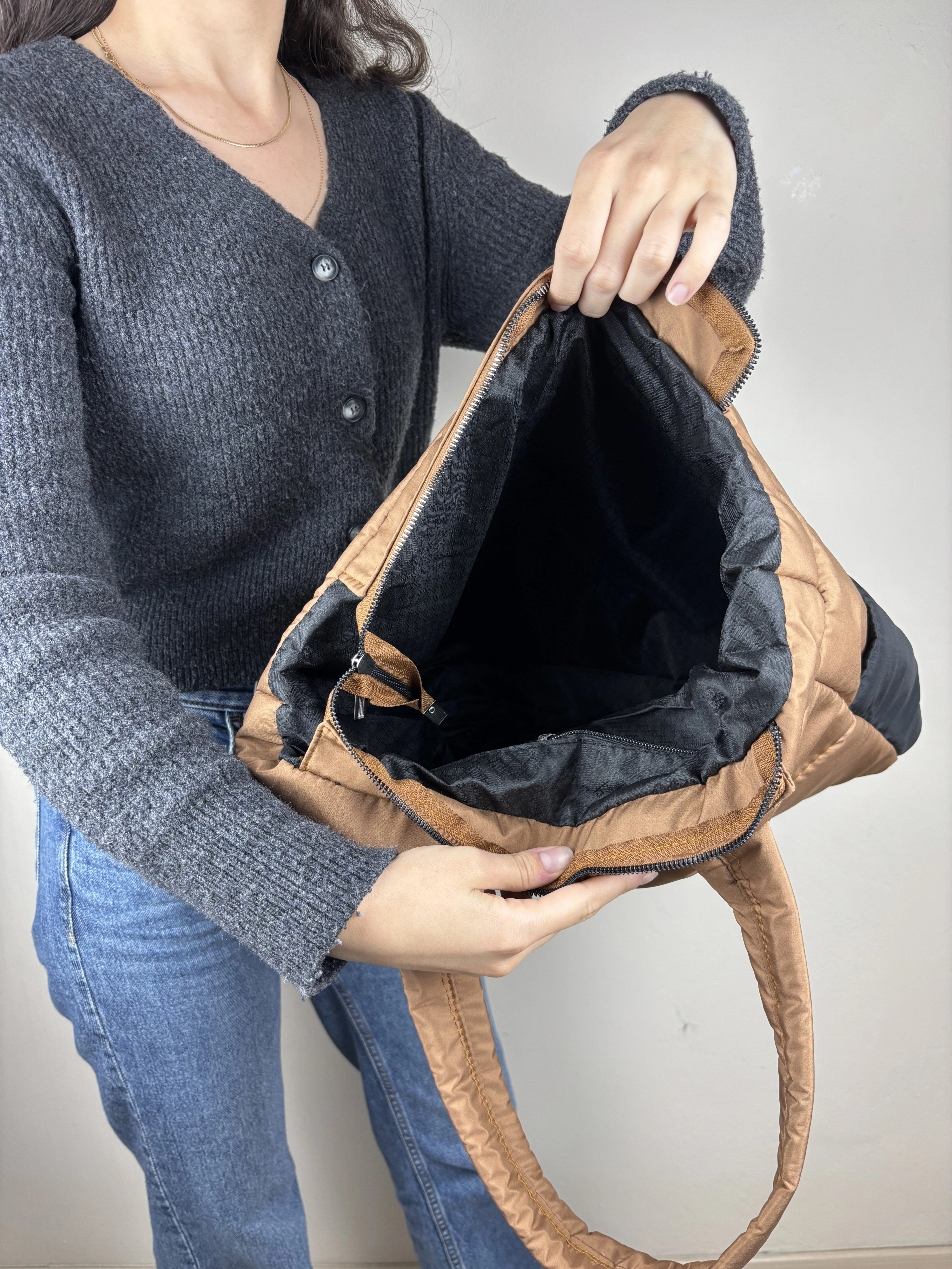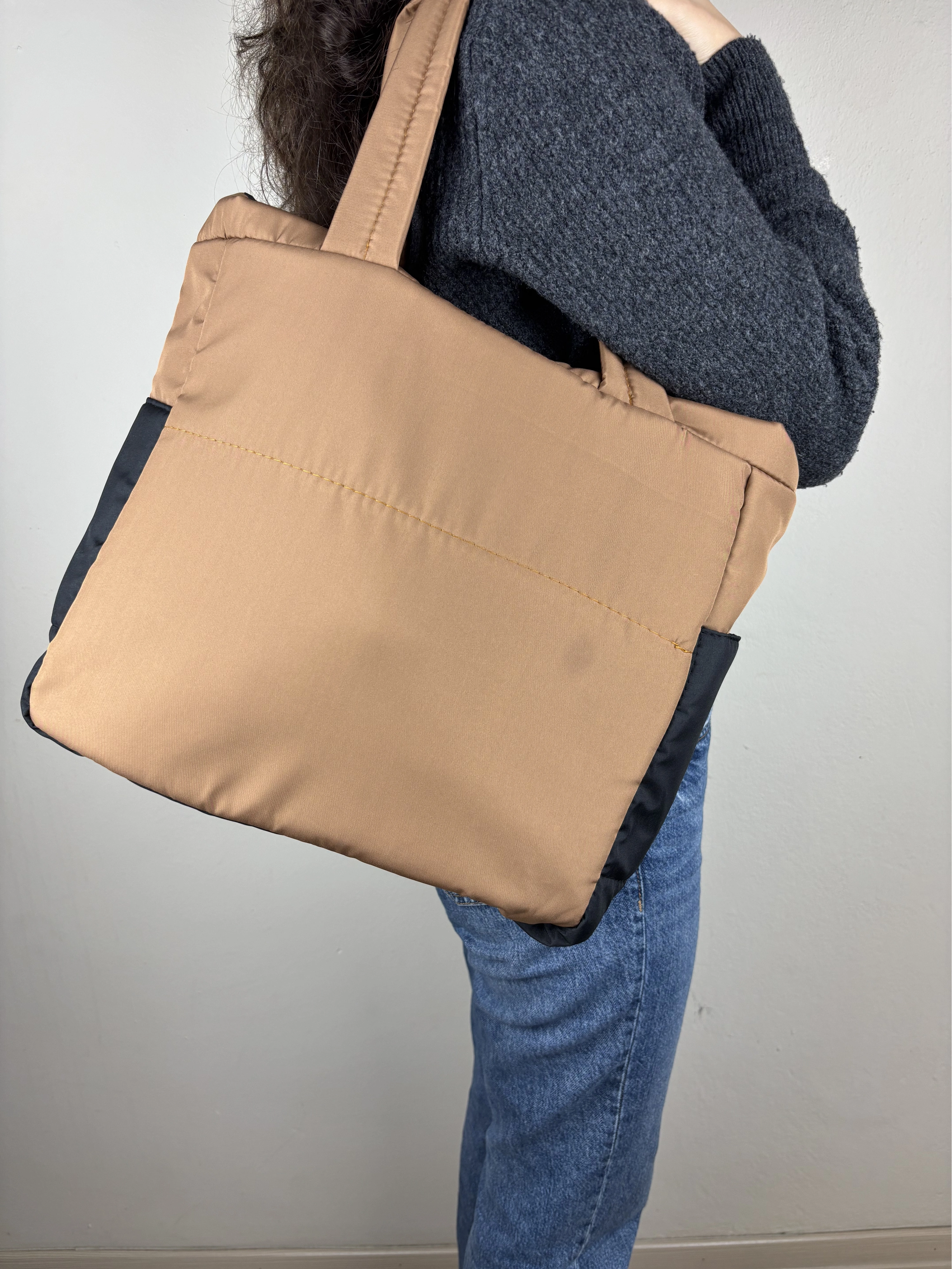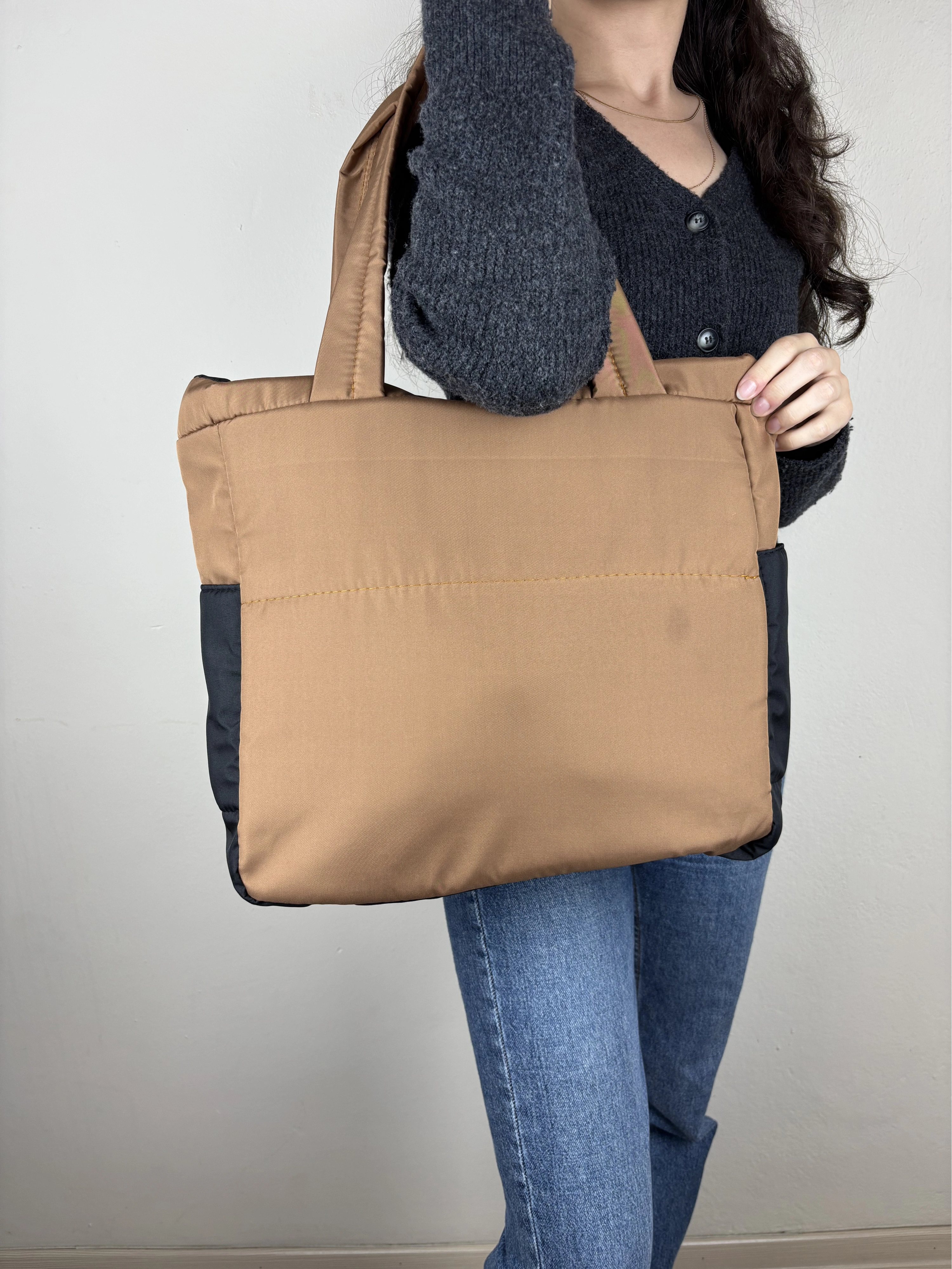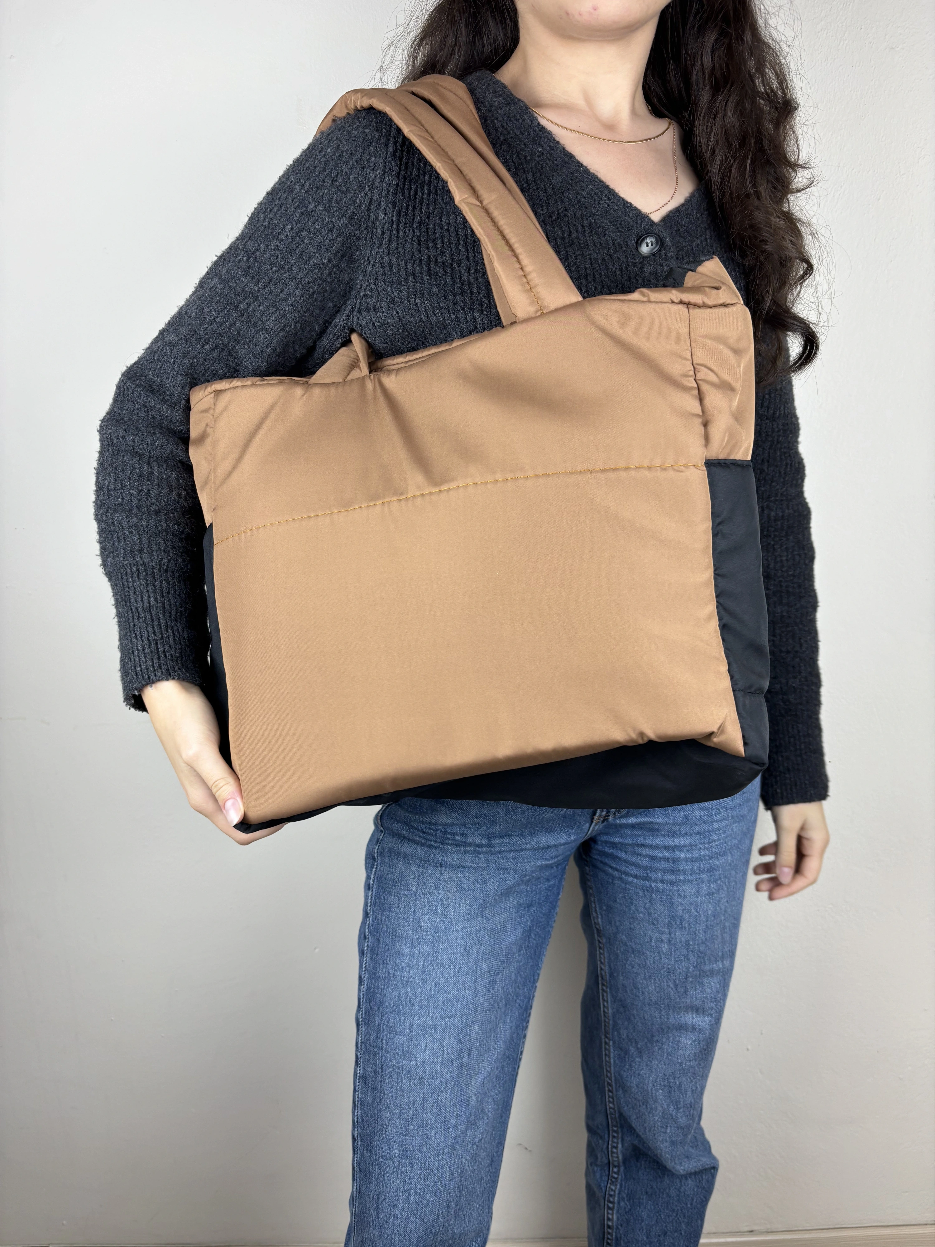 Uzun Açıklama (Ürün Sayfası): Rahatlığı ve minimalist tarzı bir araya getiren Madamia Bej Kapitone Oversize Çanta, modern şehir stiline konfor katıyor. 40 x 42 x 13 cm ölçülerindeki geniş hacmiyle laptop, kitap, su matarası ve kişisel eşyalarınızı kolayca sığdırabileceğiniz işlevsel bir modeldir. Yumuşak kapitone kumaş dokusu sayesinde hafif ve konforludur; uzun omuz sapları ise taşıma kolaylığı sağlar. Günlük kullanımda, seyahatlerde veya hafta sonu gezilerinde vazgeçilmez bir tamamlayıcıdır. Bej tonunun sıcaklığı, sade formuyla birleşerek doğal ve zamansız bir görünüm sunar. Öne Çıkan Özellikler: Malzeme: Kapitone dokulu kumaş Renk: Bej Ölçüler: 40 x 42 x 13 cm Kapama: Üst fermuar İç özellikler: Astarlı geniş iç hacim + iç fermuarlı cep Askı: Uzun omuz sapı Stil: Günlük / Seyahat / Casual Kombin Önerisi: Geniş formu ve doğal rengiyle kot pantolonlar, bej tonlu trençkotlar veya oversize sweatshirt’lerle mükemmel uyum sağlar. Günlük temponuza pratiklik ve zarif bir dokunuş ekler.