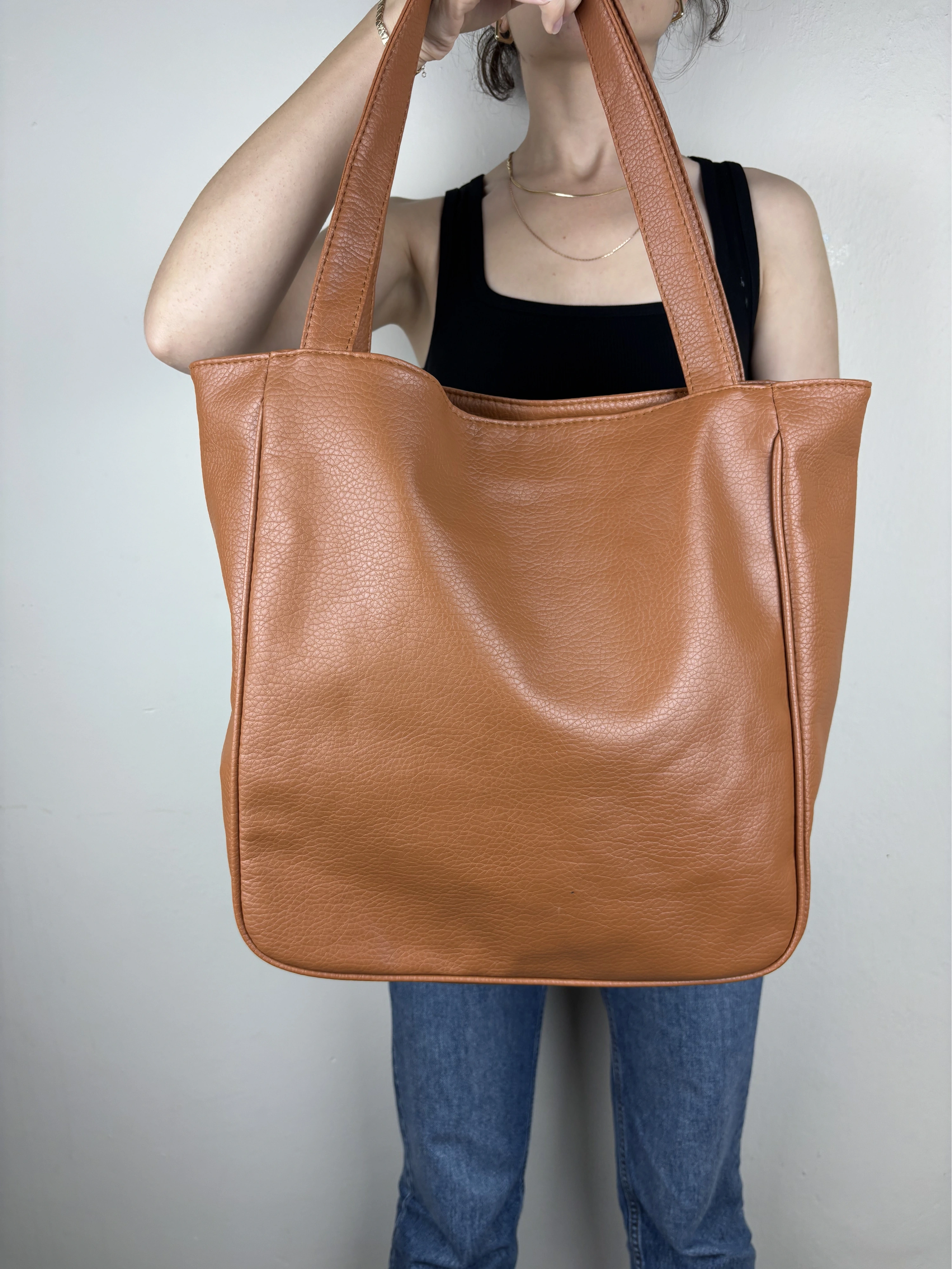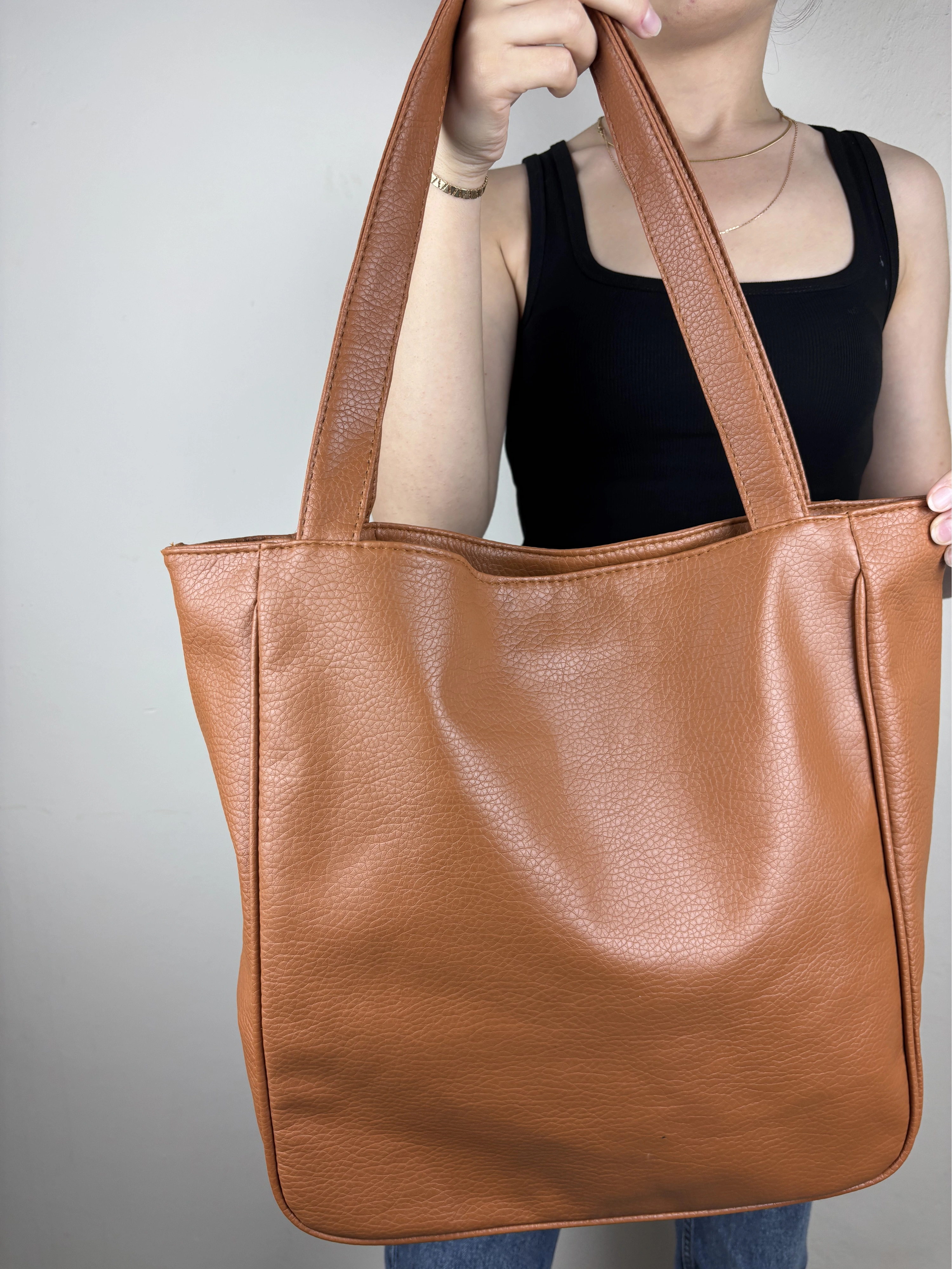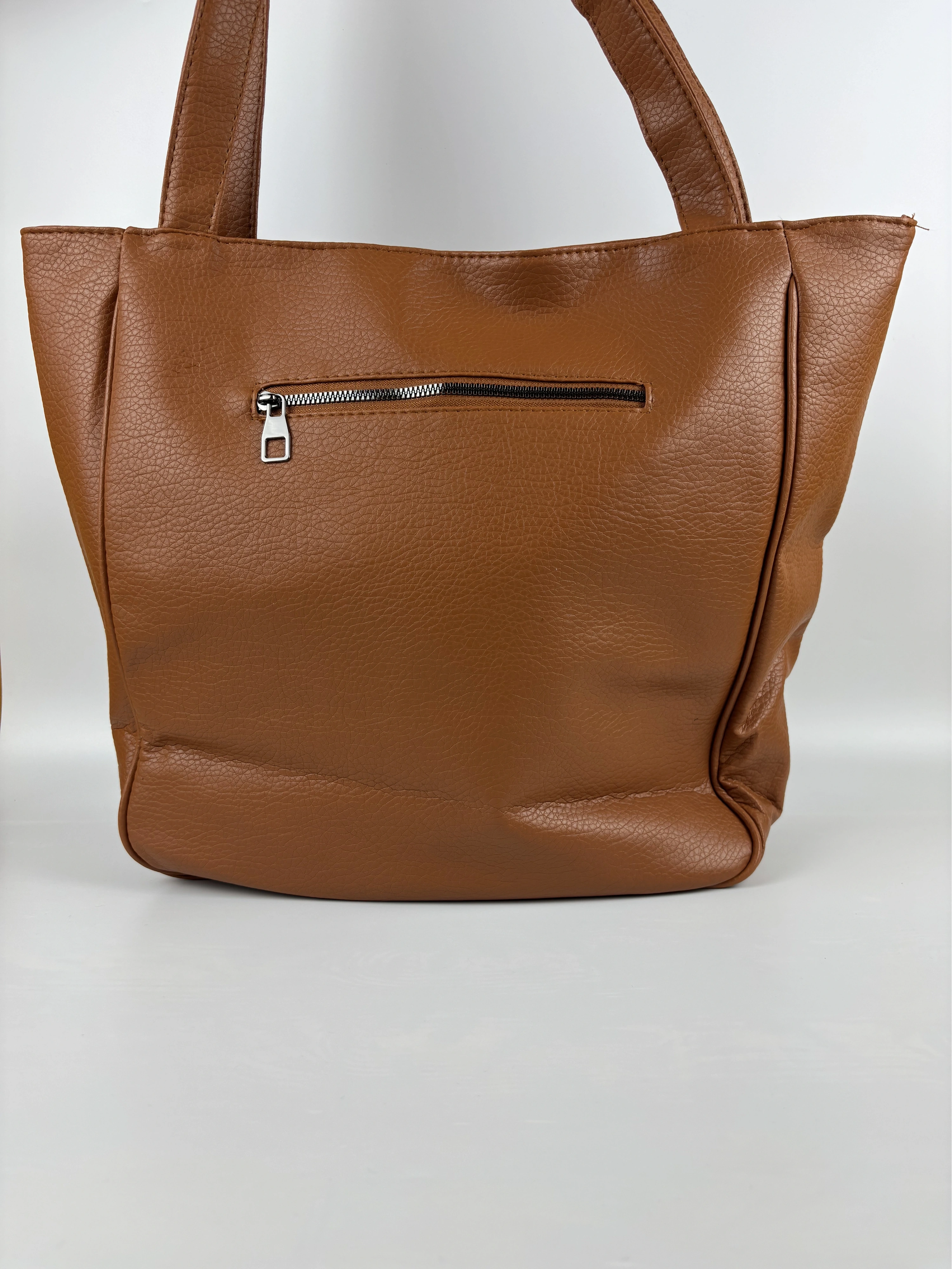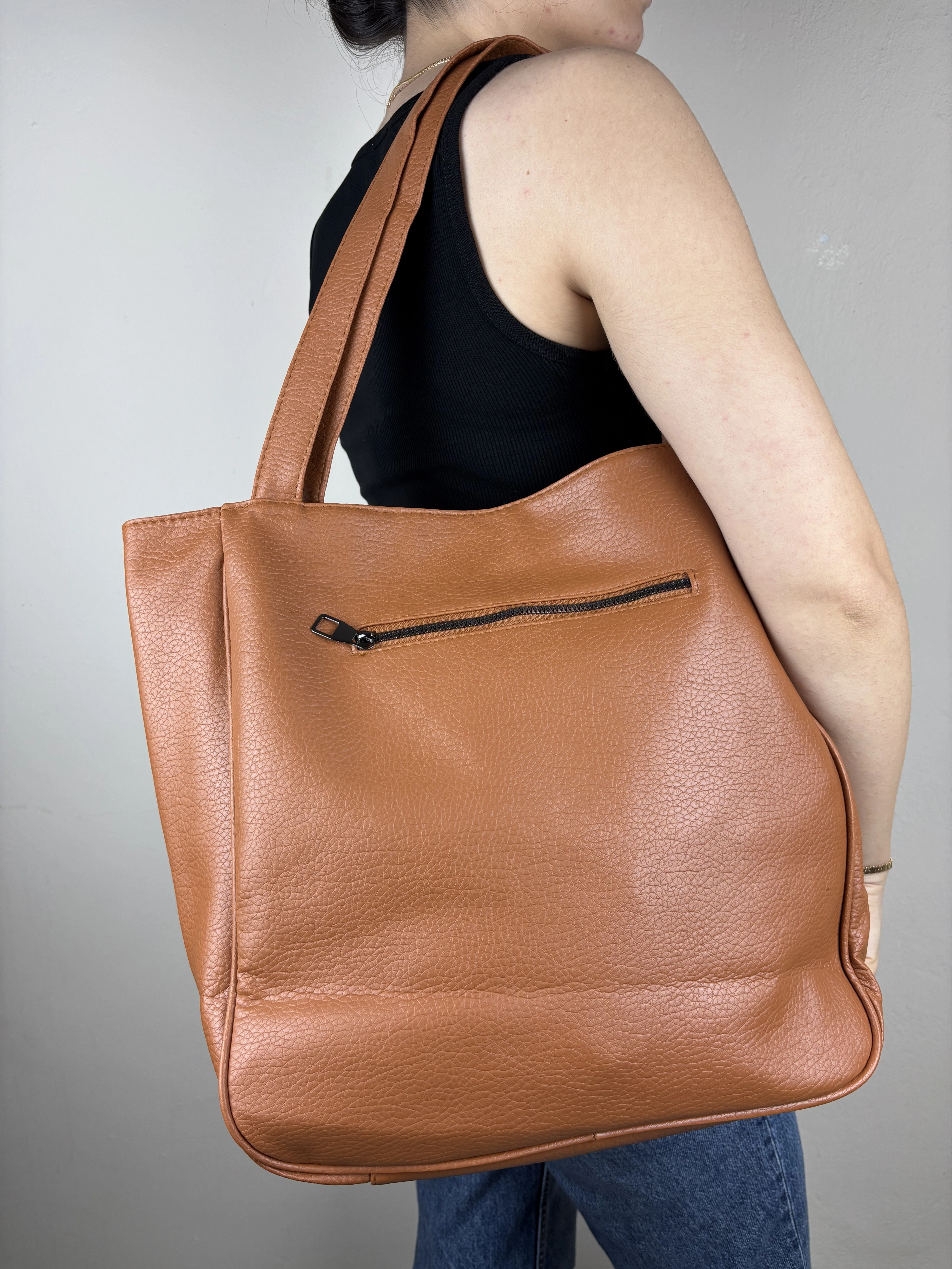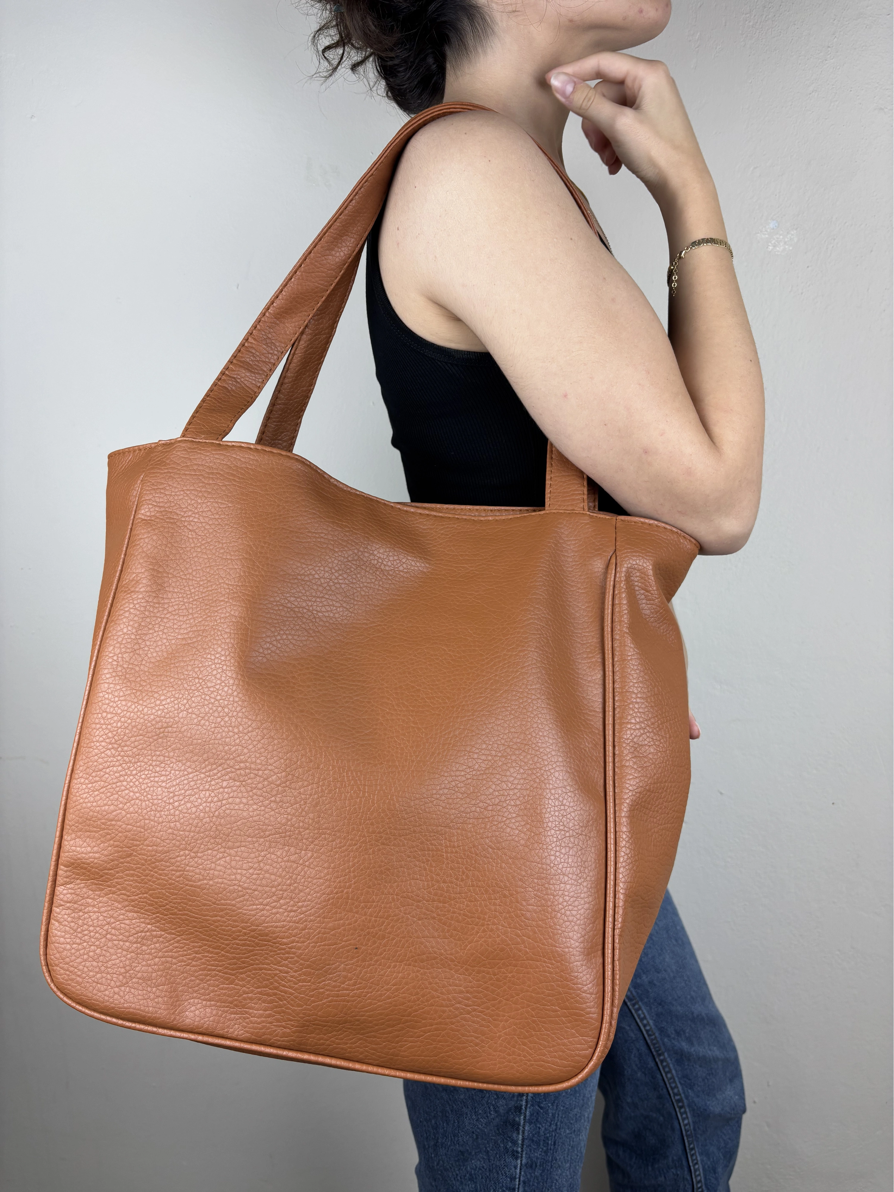 Uzun Açıklama (Ürün Sayfası): Madamia’nın sade ve güçlü tarzını yansıtan Taba Geniş Omuz Çantası, fonksiyonel yapısı ve zamansız görünümüyle hem şık hem kullanışlı bir modeldir. 42 x 38 x 12 cm ölçülerindeki geniş formu sayesinde laptop, defter, su şişesi, cüzdan ve günlük ihtiyaçlarını kolaylıkla taşıyabilirsin. Kaliteli suni deriden üretilen dokulu yüzeyi, uzun ömürlü kullanım sunarken pürüzsüz yapısı modern bir duruş kazandırır. Arka yüzündeki fermuarlı cep, sık kullandığın küçük eşyalar için pratik bir alan sağlar. Uzun omuz saplarıyla rahat taşınabilen model, minimalist tasarımıyla her kombine uyum sağlar. Öne Çıkan Özellikler: Malzeme: Dokulu kaliteli suni deri Renk: Taba Ölçüler: 42 x 38 x 12 cm Kapama: Üst fermuarlı Ek detay: Arka fermuarlı dış cep İç özellikler: Astarlı geniş iç hacim + iç fermuarlı cep Askı: Uzun omuz sapı Stil: Günlük / Ofis / Klasik Kombin Önerisi: Klasik trençkotlar, deri ceketler veya oversize takımlarla mükemmel uyum sağlar. Hem ofis günlerinde hem hafta sonu şehir şıklığında ideal bir tamamlayıcıdır.