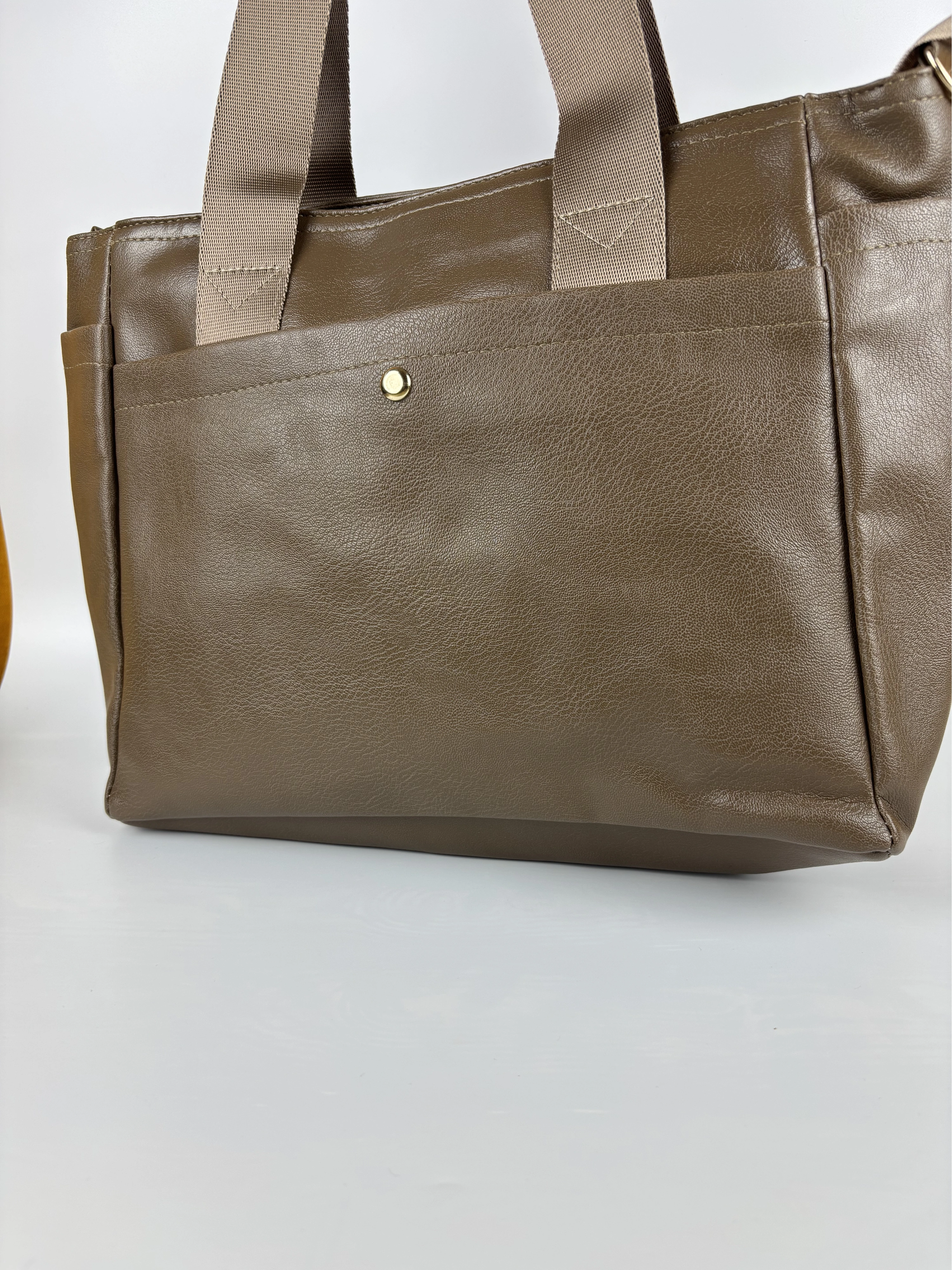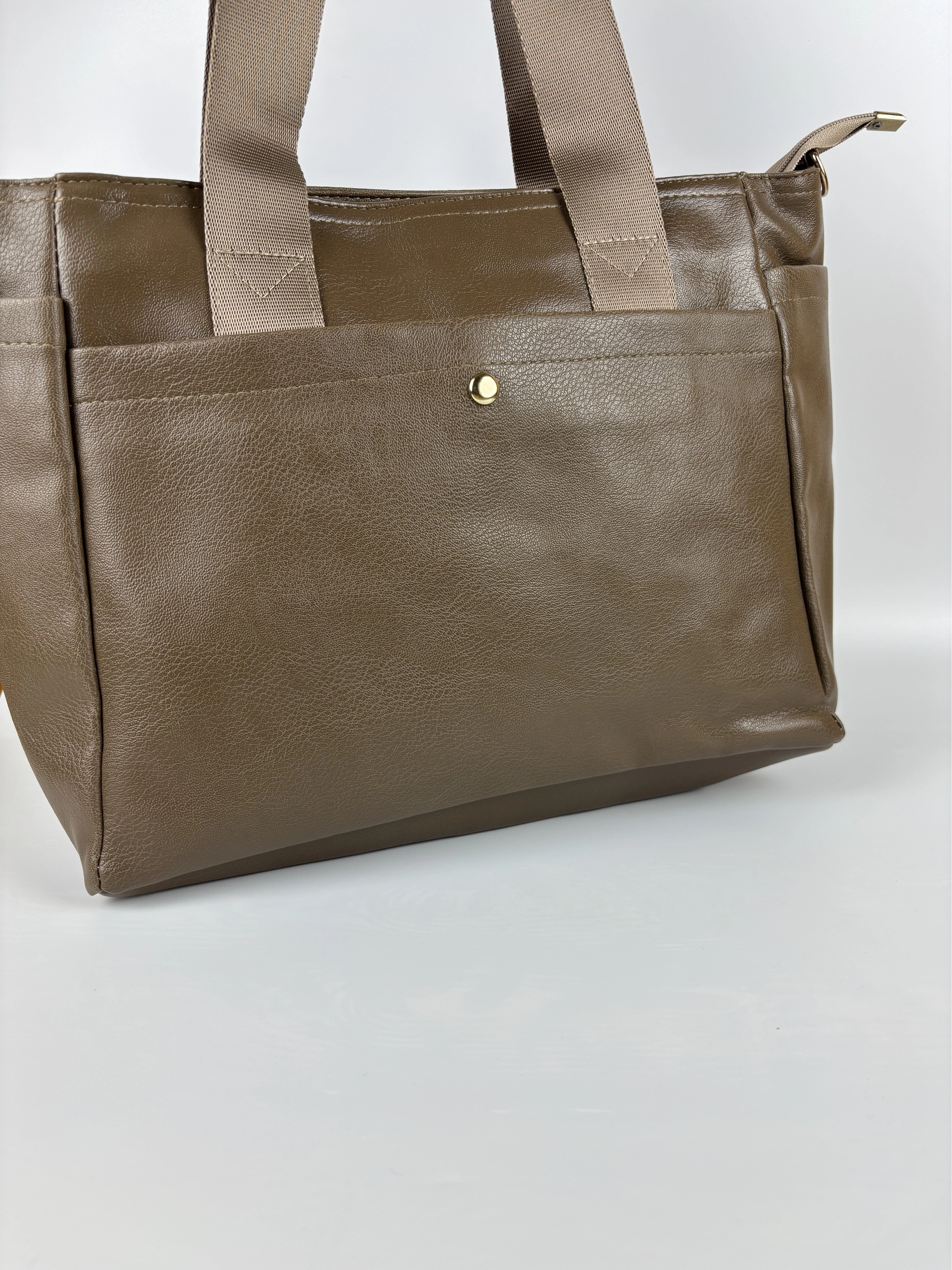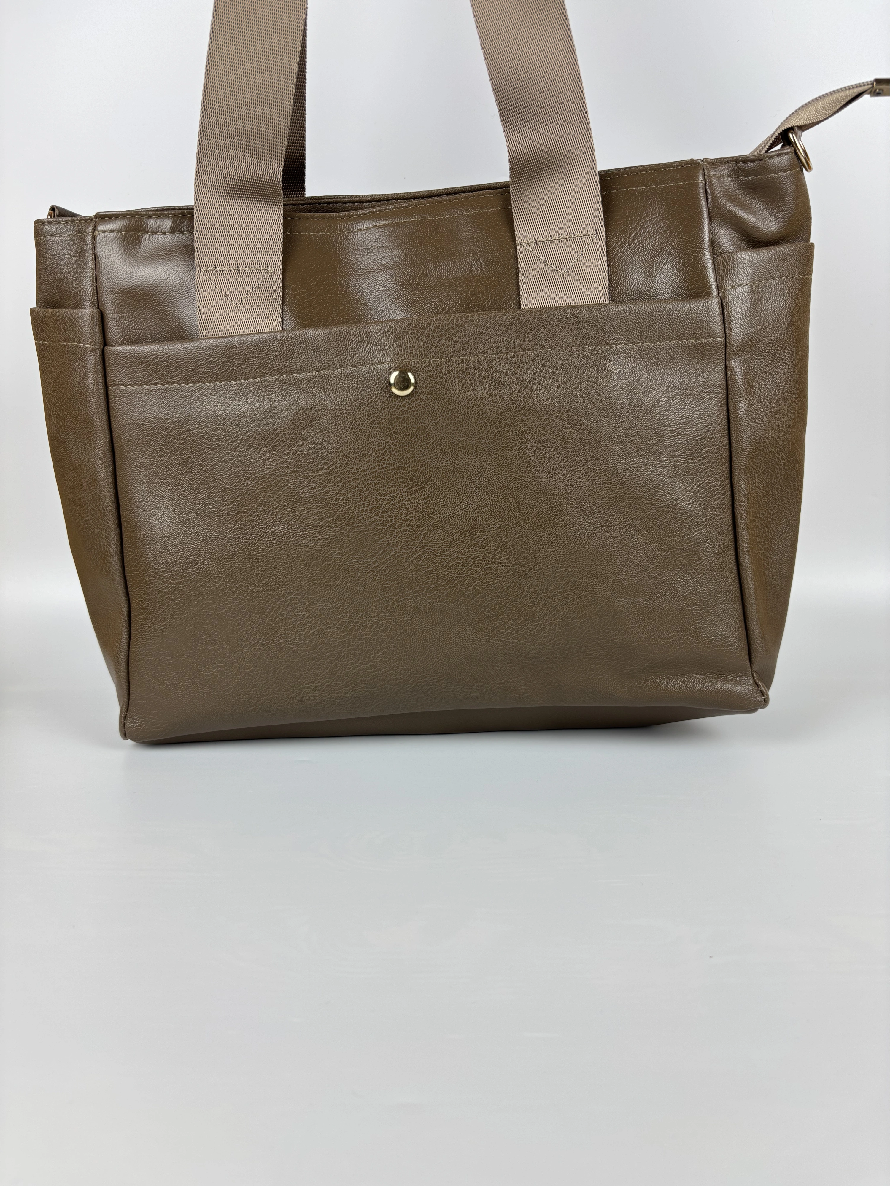Madamia’nın sade ve işlevsel tasarım çizgisini yansıtan Haki Geniş Omuz Çantası, hem günlük kullanım hem de iş hayatı için ideal bir modeldir. 40 x 25 x 12 cm ölçülerindeki geniş yapısı sayesinde defter, tablet, cüzdan ve kişisel eşyalarınızı rahatça taşıyabilirsiniz. Yumuşak dokulu kaliteli suni deriden üretilen çanta, Hakinun sıcak tonuyla her mevsim kombinlerinize zarif bir dokunuş katar. Ön yüzündeki çıtçıtlı dış cep ve iç kısmındaki fermuarlı bölme sayesinde eşyalarınızı düzenli ve kolay erişilebilir şekilde saklayabilirsiniz. Dayanıklı kumaş sapları uzun süreli kullanımlarda konfor sağlarken, fermuarlı ana bölmesi güvenli bir kullanım sunar. Öne Çıkan Özellikler: Malzeme: Kaliteli suni deri Renk: Haki Ölçüler: 40 x 25 x 12 cm Kapama: Üst fermuarlı Ek detay: Ön yüzde çıtçıtlı dış cep İç özellikler: Astarlı geniş iç hacim + küçük fermuarlı cep Askı: Dayanıklı kumaş omuz sapı Stil: Günlük / Ofis / Casual Kombin Önerisi: Bej, Haki veya krem tonlarında triko takımlar, gömlekler ya da blazer ceketlerle mükemmel uyum sağlar. Günlük şıklığını sade ve modern bir dokunuşla tamamlar.