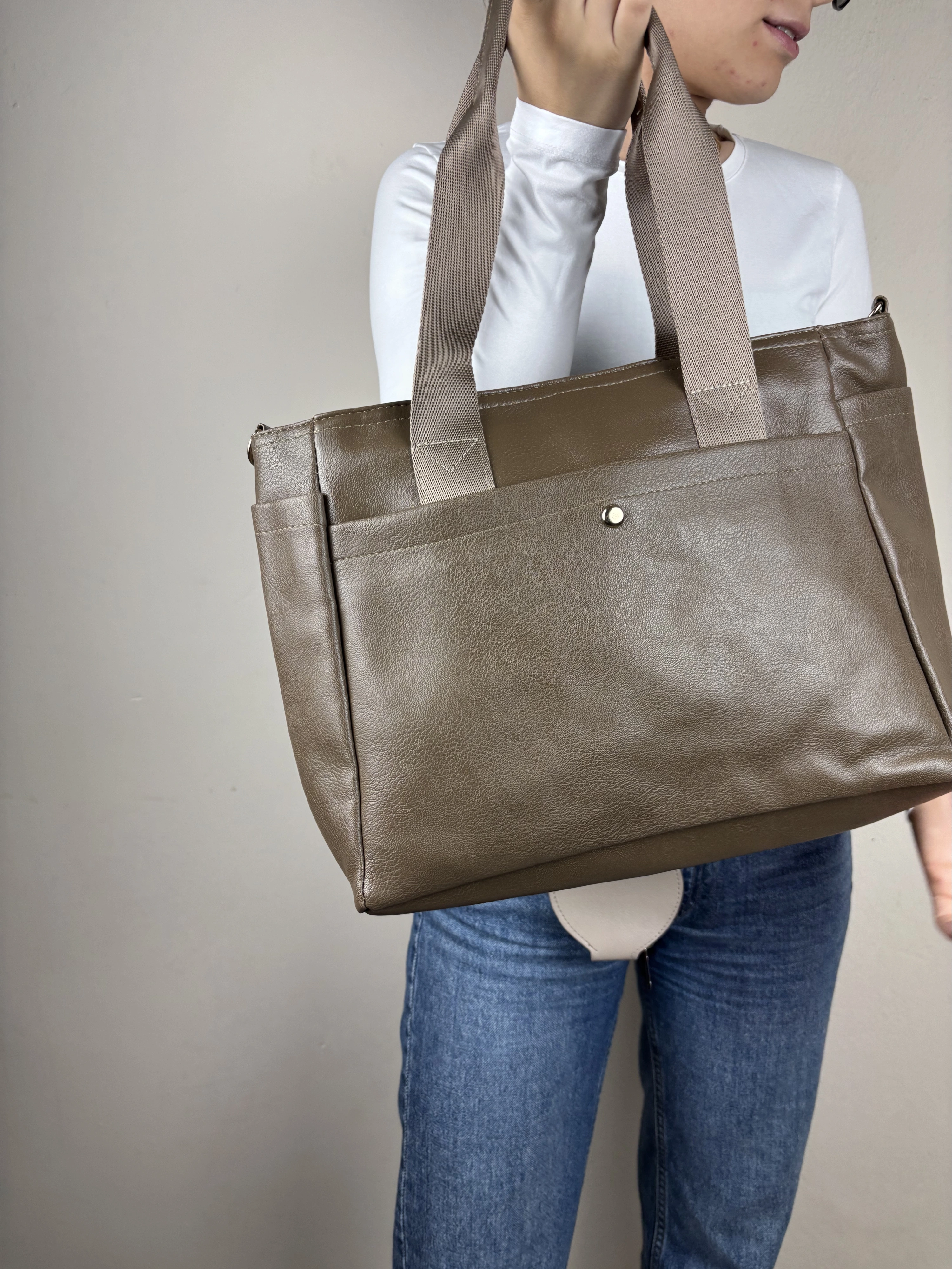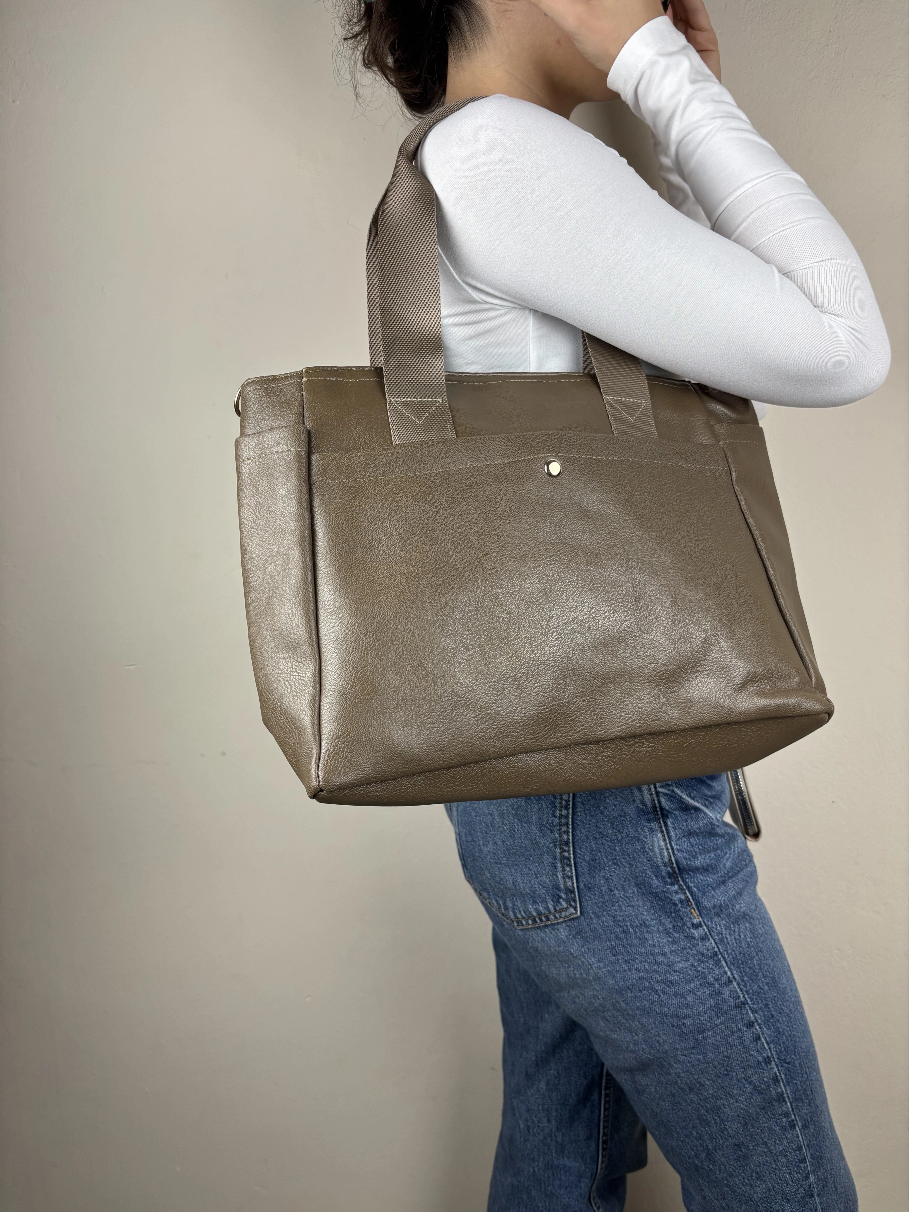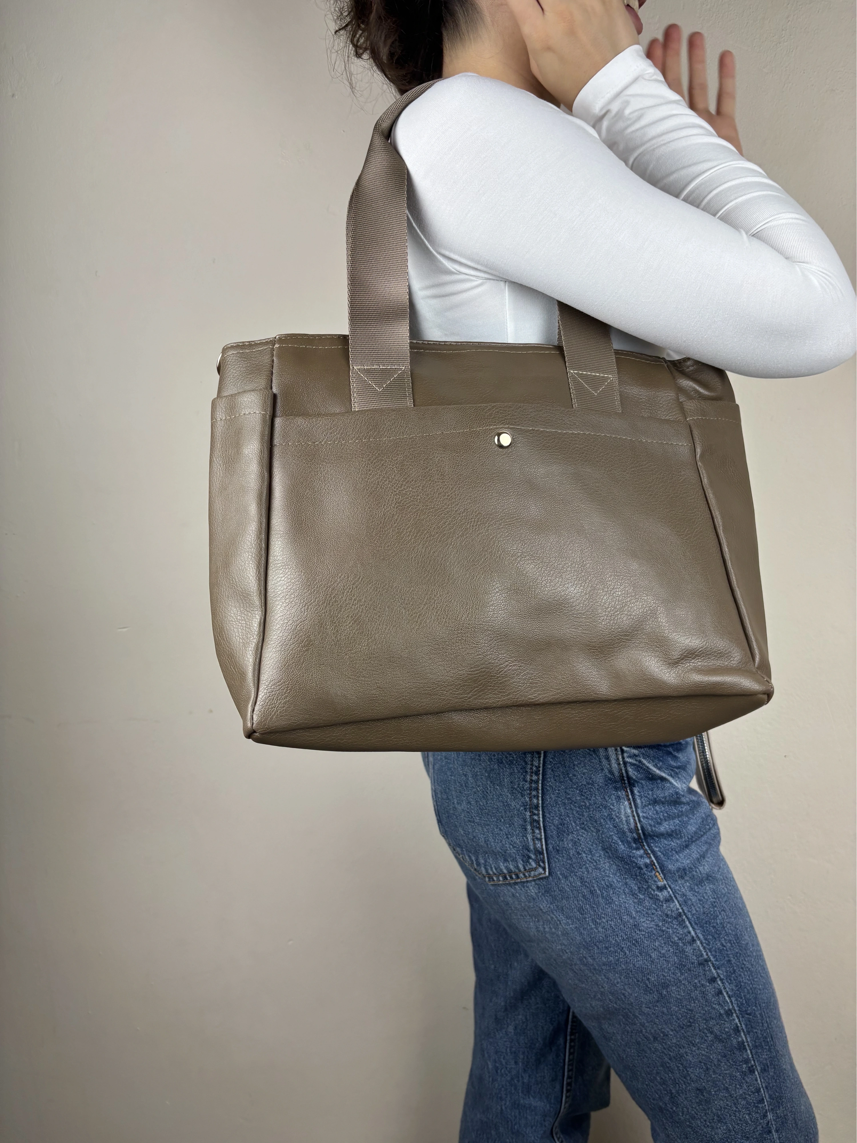 Madamia’nın sade ve işlevsel tasarım çizgisini yansıtan Haki Geniş Omuz Çantası, hem günlük kullanım hem de iş hayatı için ideal bir modeldir. 40 x 25 x 12 cm ölçülerindeki geniş yapısı sayesinde defter, tablet, cüzdan ve kişisel eşyalarınızı rahatça taşıyabilirsiniz. Yumuşak dokulu kaliteli suni deriden üretilen çanta, Hakinun sıcak tonuyla her mevsim kombinlerinize zarif bir dokunuş katar. Ön yüzündeki çıtçıtlı dış cep ve iç kısmındaki fermuarlı bölme sayesinde eşyalarınızı düzenli ve kolay erişilebilir şekilde saklayabilirsiniz. Dayanıklı kumaş sapları uzun süreli kullanımlarda konfor sağlarken, fermuarlı ana bölmesi güvenli bir kullanım sunar. Öne Çıkan Özellikler: Malzeme: Kaliteli suni deri Renk: Haki Ölçüler: 40 x 25 x 12 cm Kapama: Üst fermuarlı Ek detay: Ön yüzde çıtçıtlı dış cep İç özellikler: Astarlı geniş iç hacim + küçük fermuarlı cep Askı: Dayanıklı kumaş omuz sapı Stil: Günlük / Ofis / Casual Kombin Önerisi: Bej, Haki veya krem tonlarında triko takımlar, gömlekler ya da blazer ceketlerle mükemmel uyum sağlar. Günlük şıklığını sade ve modern bir dokunuşla tamamlar.