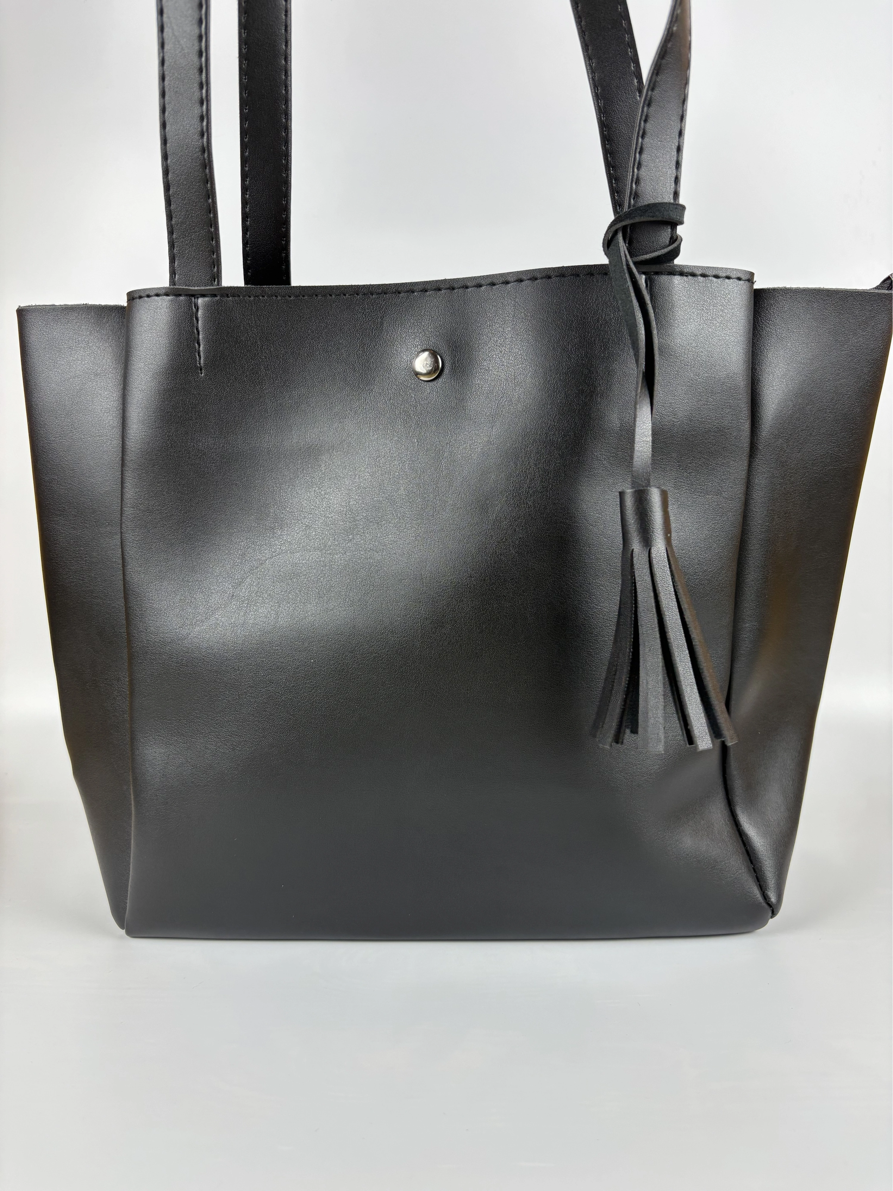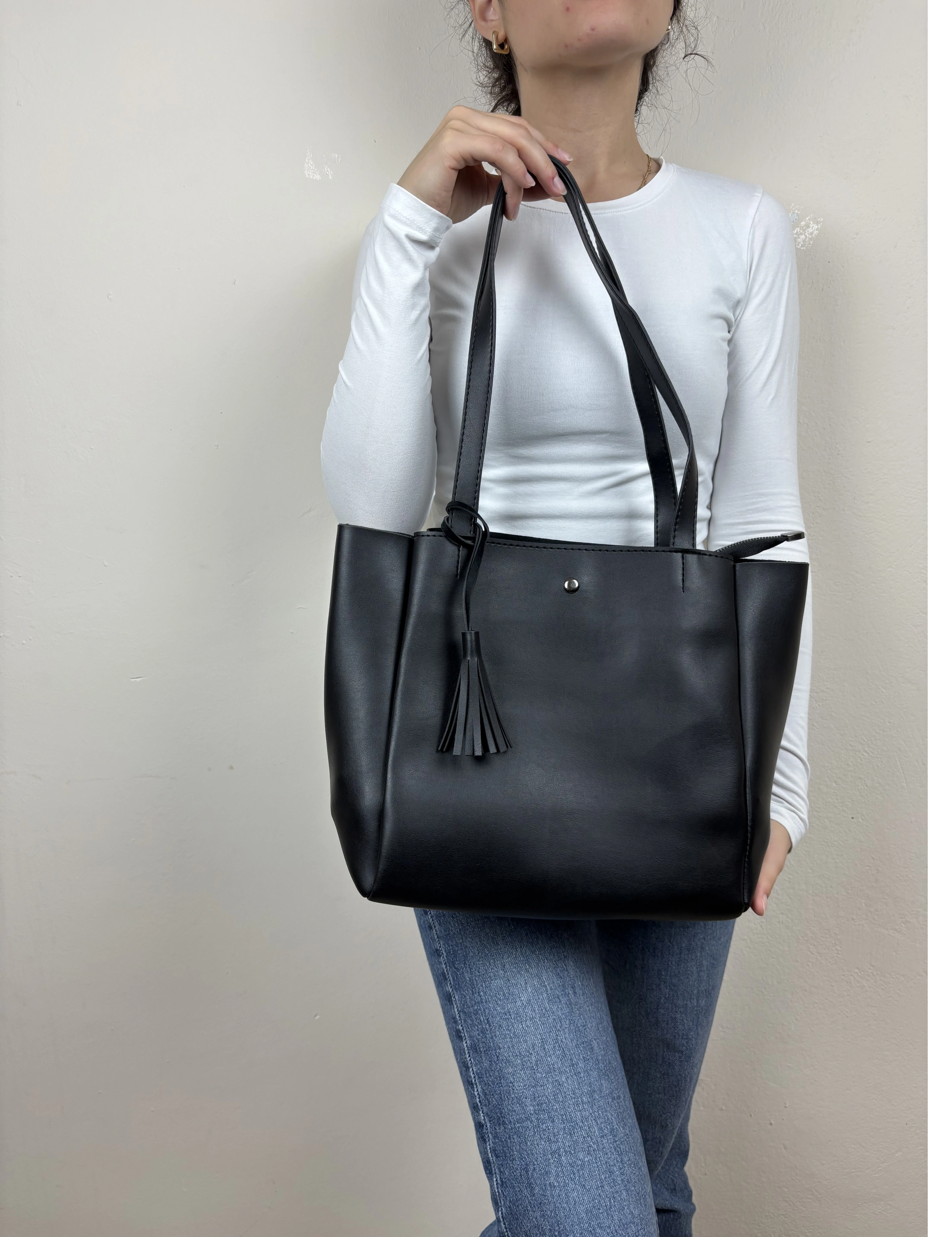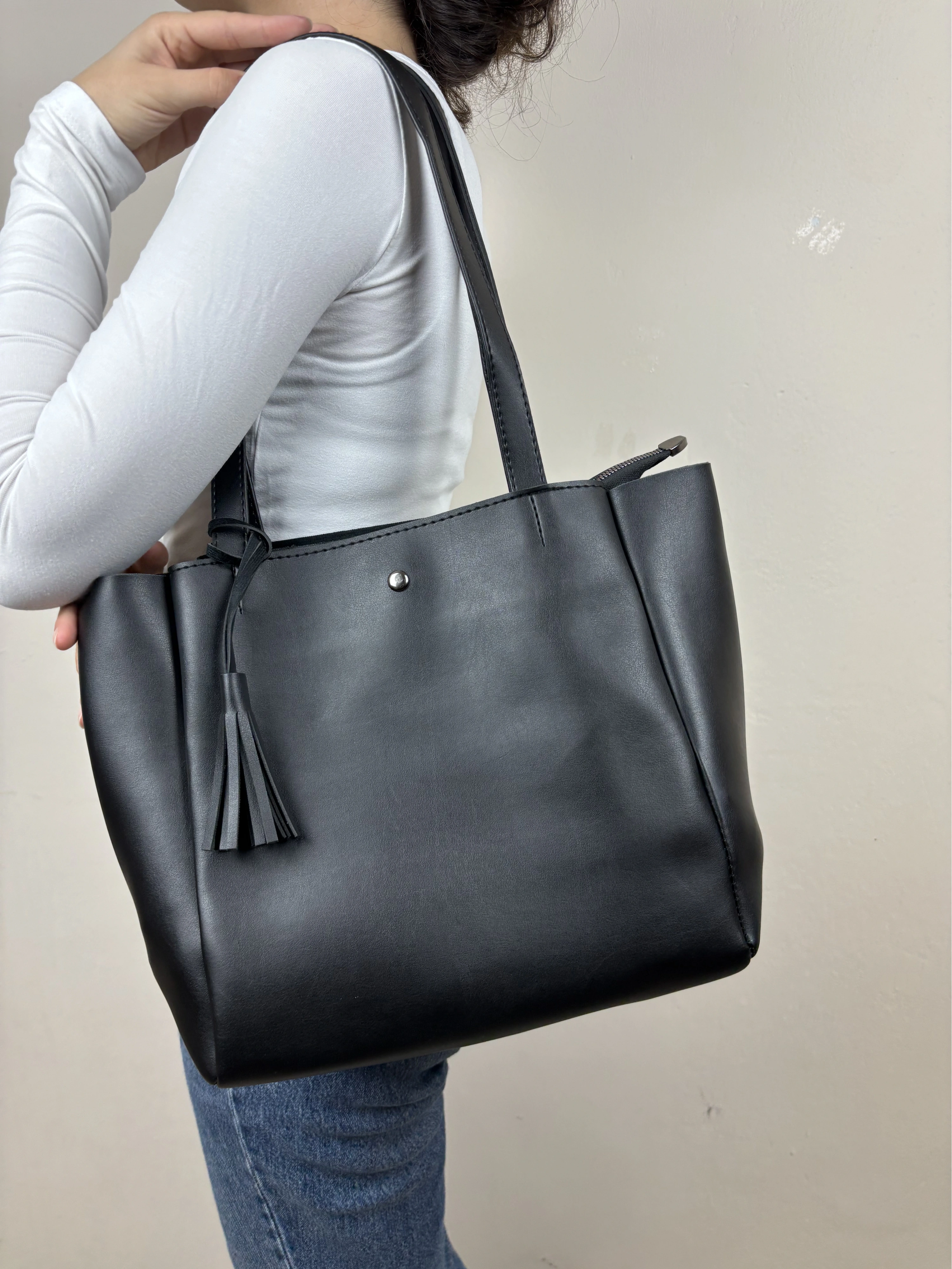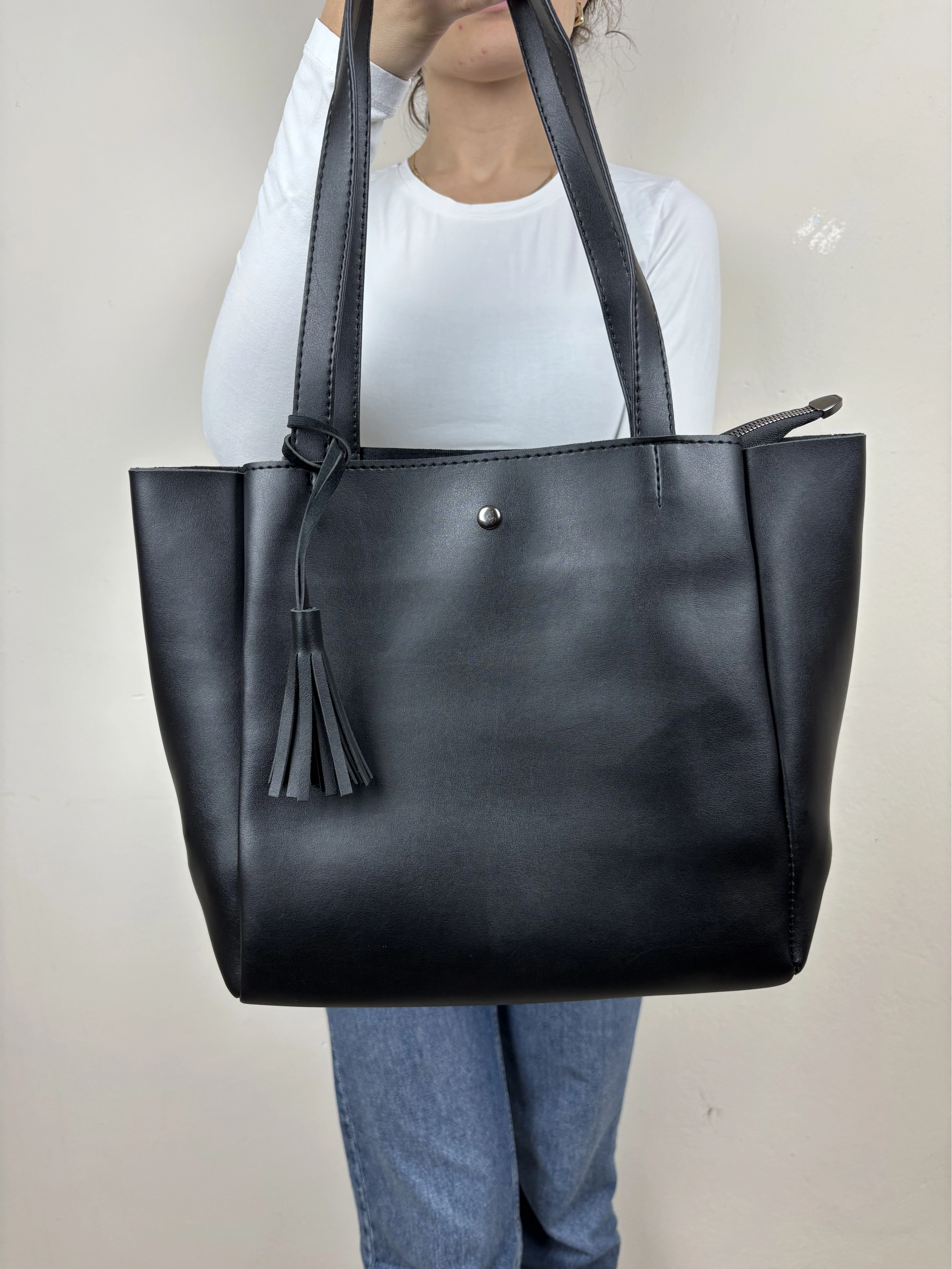 Madamia’nın sade ama güçlü çizgisini yansıtan Siyah Püskül Detaylı Omuz Çantası, minimal tasarımı ve zarif detaylarıyla her kombine modern bir dokunuş katar. 37 x 27 x 12 cm ölçülerindeki geniş formu, günlük kullanımda konfor ve işlevselliği bir araya getirir. Kaliteli suni deriden üretilmiş pürüzsüz yüzeyi, uzun omuz saplarıyla birleşerek konforlu bir taşıma sağlar. Ön yüzündeki sade metal detay ve kenarındaki püskül aksesuar, çantaya sofistike bir karakter kazandırır. Hem ofis hem günlük kullanıma uygun yapısıyla zamansız bir şıklık sunar. Öne Çıkan Özellikler: Malzeme: Kaliteli suni deri Renk: Siyah Ölçüler: 37 x 27 x 12 cm Kapama: Üst fermuar Aksesuar: Püskül detayı + minimal metal düğme Askı: Uzun omuz sapı Stil: Günlük / Ofis / Minimal Kombin Önerisi: Klasik siyah elbiselerden jean ve gömlek kombinlerine kadar her stile uyum sağlar. Püskül detayıyla sade kombinlere zarif bir hareketlilik kazandırır.