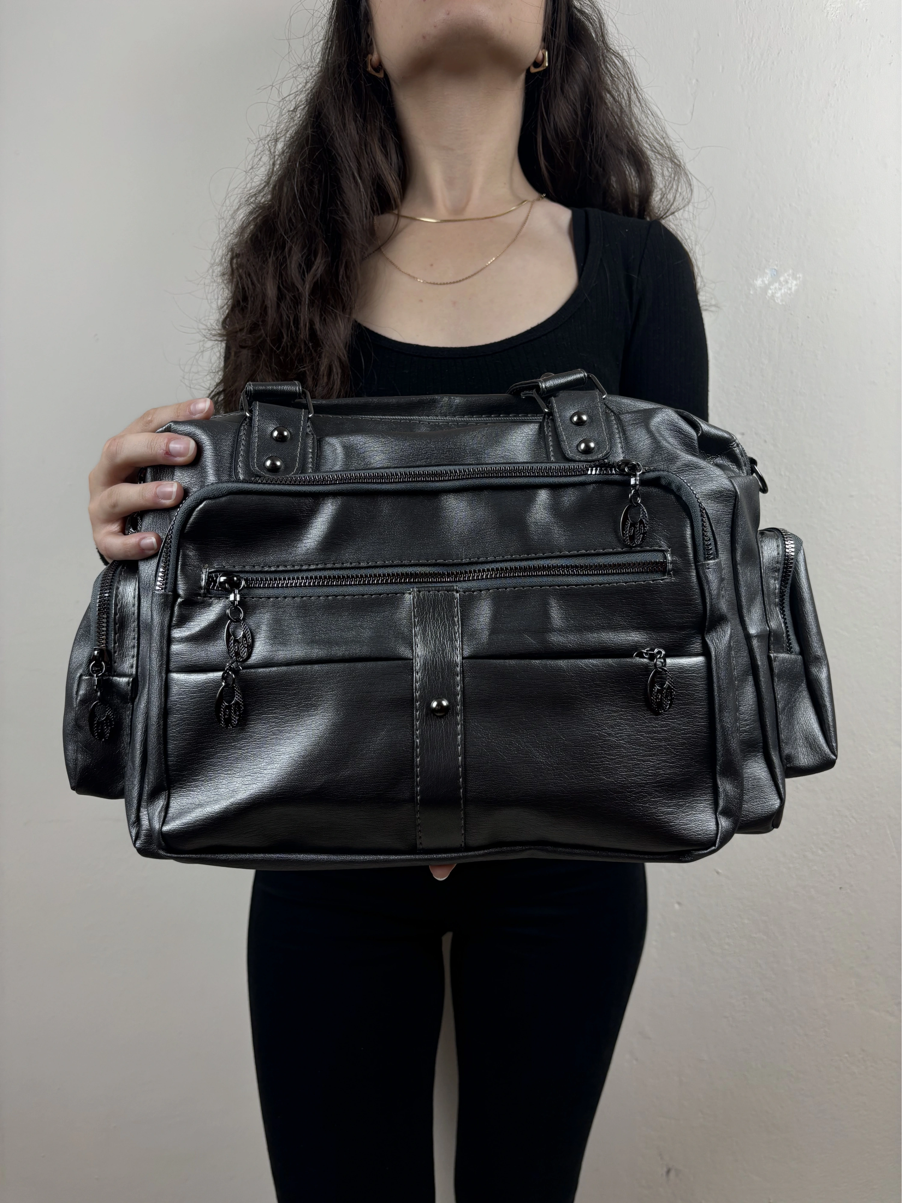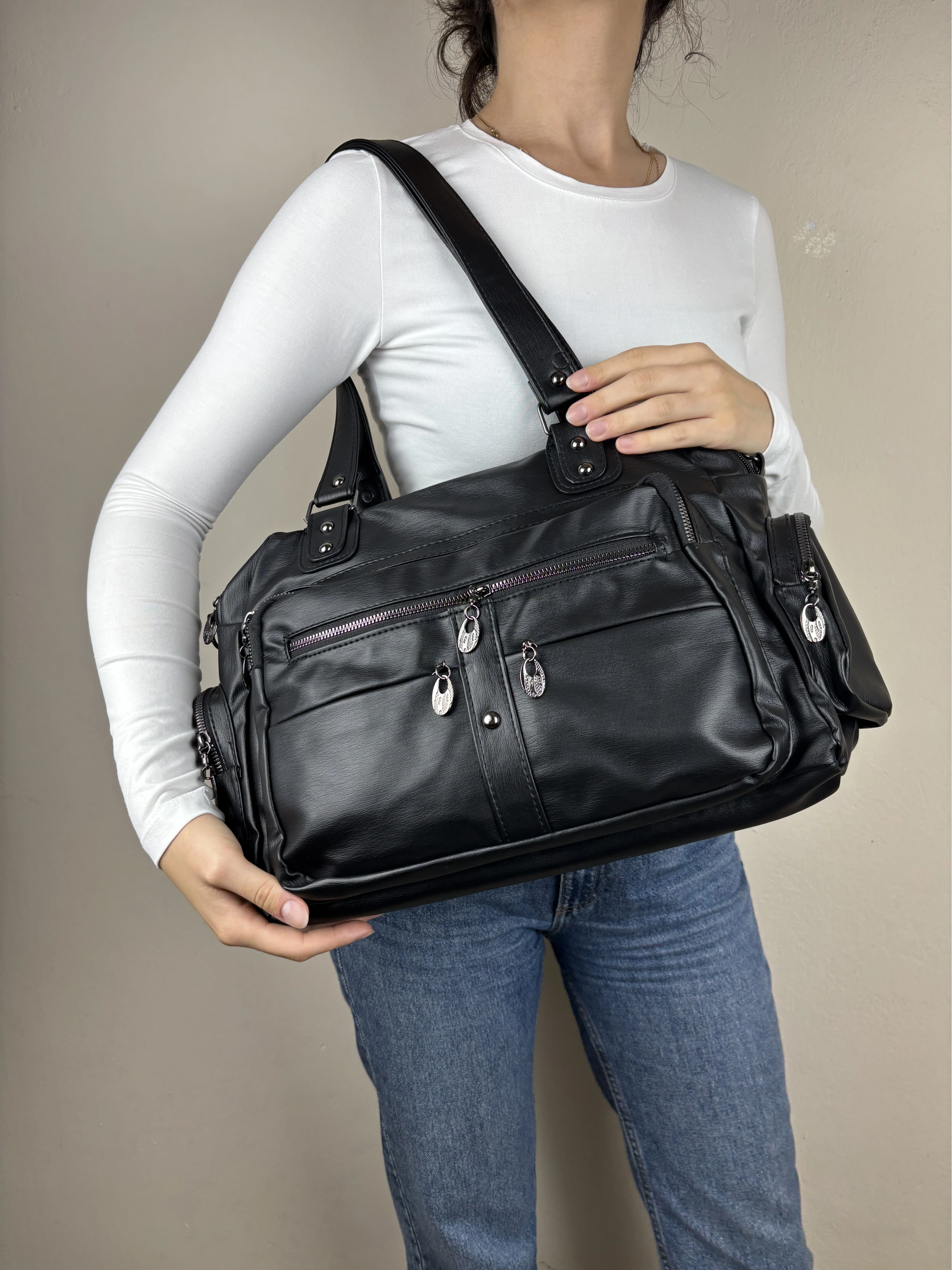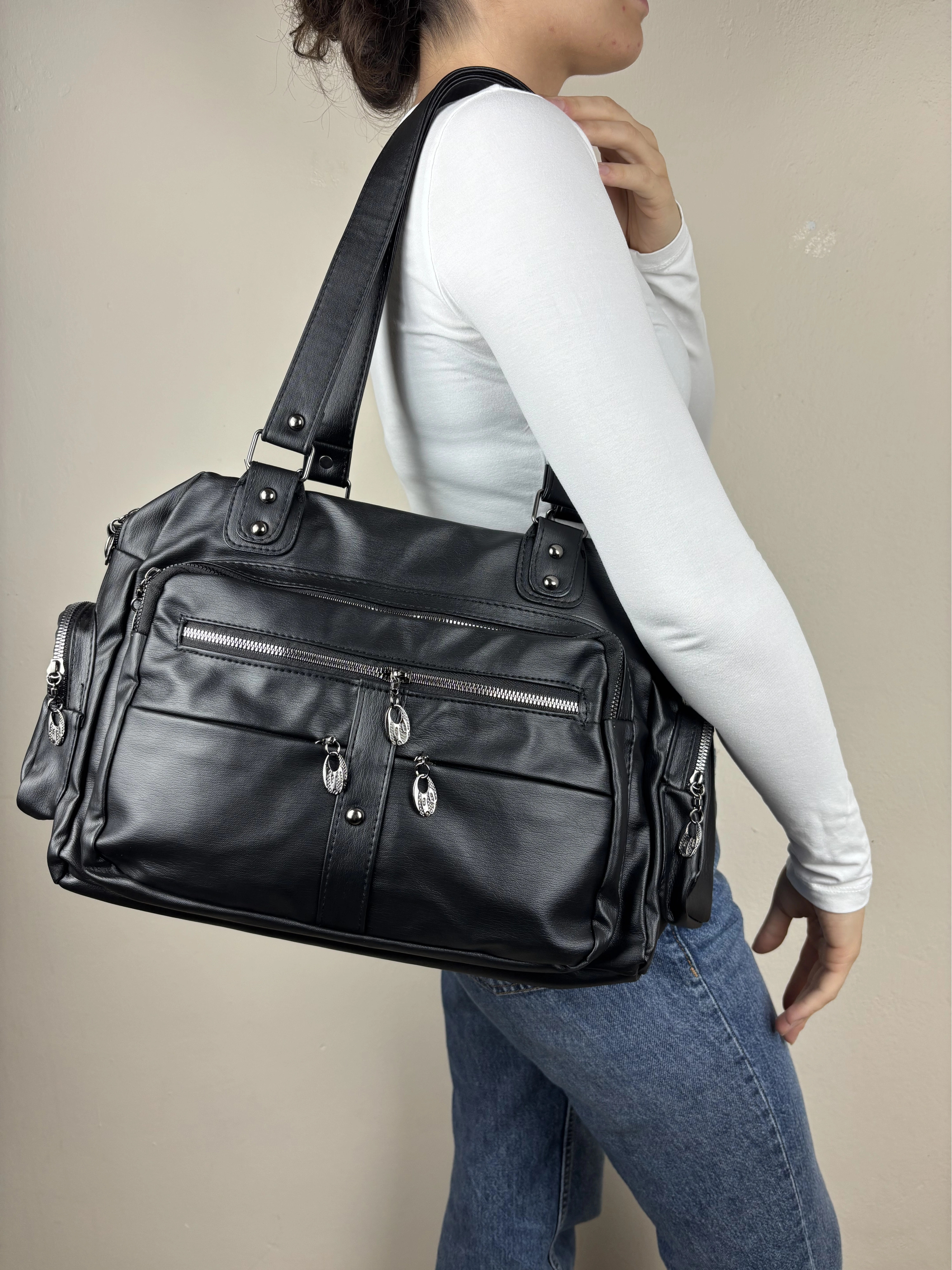 Uzun Açıklama (Ürün Sayfası): Madamia’nın güçlü ve fonksiyonel tasarım anlayışını yansıtan Siyah Çok Bölmeli Büyük Çanta, geniş hacmi ve çok cepli yapısıyla hem şıklık hem pratiklik sunar. 44 x 30 x 14 cm ölçülerindeki yapısı sayesinde günlük kullanımın yanı sıra kısa seyahatlerde de rahatlıkla tercih edilebilir. Kaliteli suni deriden üretilen parlak Siyah yüzeyi, gümüş detaylı fermuarlarla tamamlanarak modern bir görünüm oluşturur. Ön, arka ve yan kısımlarda yer alan çoklu cepler, eşyalarınızı düzenli biçimde saklamanı sağlar. Sağlam çift saplı tasarımı konforlu taşımayı desteklerken, çıkarılabilir omuz askısı kullanım esnekliği sunar. Öne Çıkan Özellikler: Malzeme: Kaliteli suni deri Renk: Siyah Ölçüler: 44 x 30 x 14 cm Kapama: Üst fermuarlı Ek detaylar: Ön, arka ve yan fermuarlı cepler İç özellikler: Astarlı geniş iç hacim + küçük iç cep Askı: Çift elde taşıma sapı + çıkarılabilir omuz askısı Stil: Günlük / Seyahat / Casual Kombin Önerisi: Koyu kahve, bej veya krem tonlarıyla mükemmel uyum yakalar. Seyahatlerde, iş günlerinde veya hafta sonu gezilerinde işlevsel ve zarif bir tamamlayıcıdır.